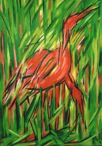 Kraniche knallrot und pink schreiten als Paar durch das Grün. Steif wächst das Schilfrohr empor. Lang gestreckt sind Schnabel und Beine. Schneller rhythmischer Wechsel von Grün und Rot, von Vogel und Schilf, Kranich und Rohr.