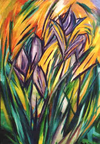 Lilafarbene Schwertlilien erblühen vor abend-dämmrigem Himmel. Hier ein fertiges Blumengesicht, dort ein Wachsen und Schieben, ein Suchen nach der Blütenform, oder schon ein Vergehen? Blätter sind hart und spitz wie gezückte Degen. Violette Lichtblitze auf blankem Blättergrün. Kampf und Tod. Entstehen und Verblühen. Dynamik von Farbe und Form.