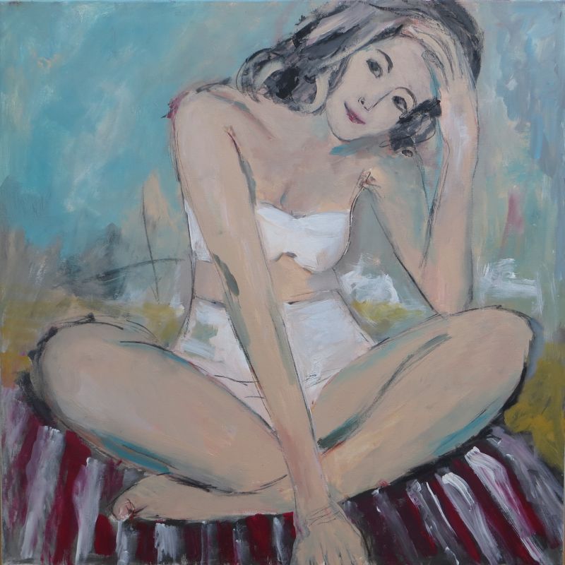 In sich versunken, gerundet und abgeschottet. Angewinkeltes Knie. Kopf auf angewinkelte Arme gestützt. In sich ruhend, innehaltend. Traurig - Warum? Nachdenklich - Worüber? Machtlos gegen das Außen und den Kampf im Innern. Einigeln und stark sein. Nur nicht zu lange baden in bittersüßer Melancholie, im lilafarbenen Alles und Nichts. Die Welt ist wie sie ist.